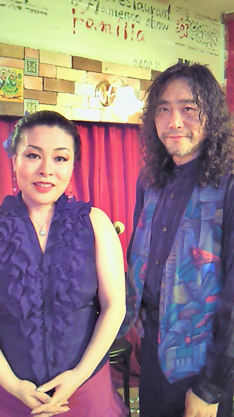 今年初ライヴがファミリアにて,素晴らしい共演をさせて頂きました。今回はギタ-リストとして出演の山本先生です!(本来は有名な男性舞踊手です!)14年?ぶりの共演です!山本先生は,小野恵美子先生のフラメンコ公演の相手役で,私は,舞踊団員の時に山本先生から,沢山,フラメンコを学ばさせて頂きました。そして,私がデビュ-した時も,いろいろな所で,歌や踊りの伴奏も,して頂きました。懐かしかったです!力強いギタ-の音色!さすが踊り手なのでリズム感が素晴らしくテンション上がりました!リハは緊張してボロボロで,どうなる事か?心配でしたが何とか楽しくライウ゛出来ました!いろいろお世話になりましてありがとうございました。